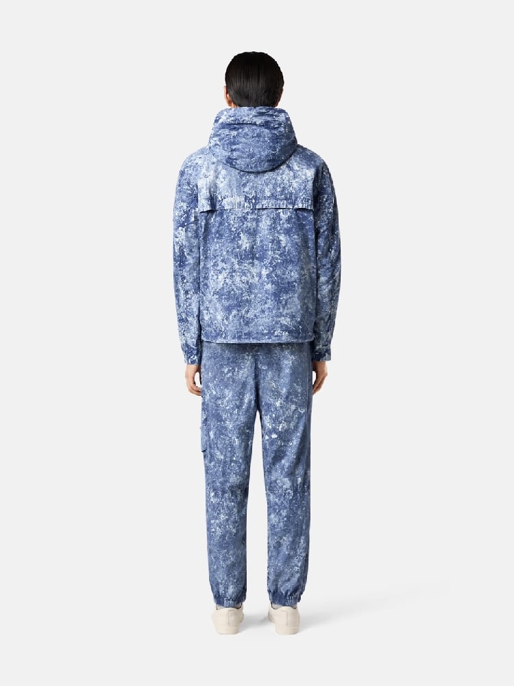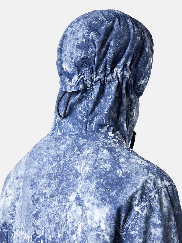 Hooded jacket made from a very fine stretch canvas. The piece is garment dyed with anti-drop, then undergoes a white pigment treatment to create an all-over motif.